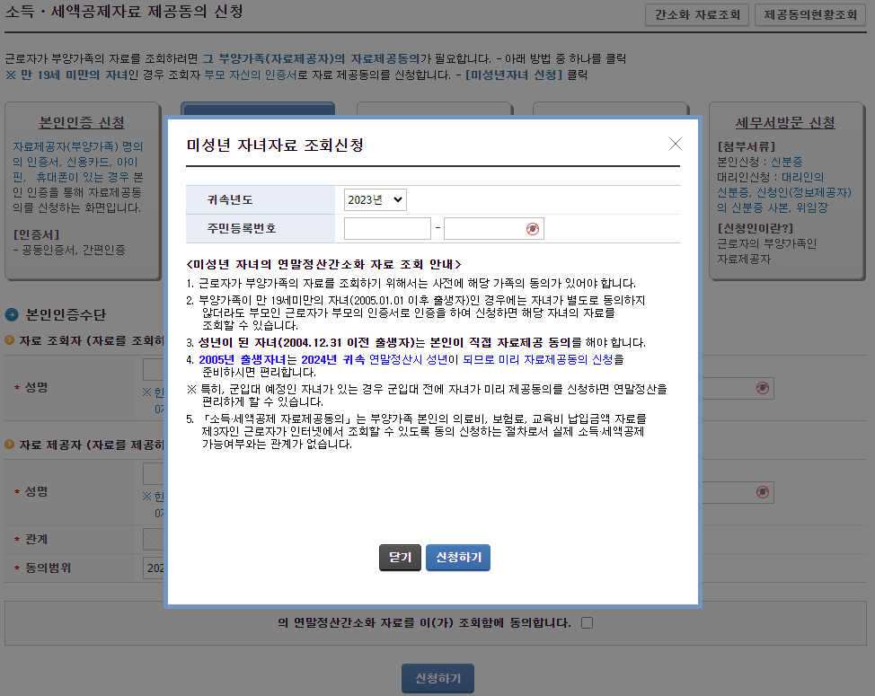 2. 연말정산 ▶ 연말정산간소화 ▶ 부양가족 자료제공 동의/조회를 클릭하세요.