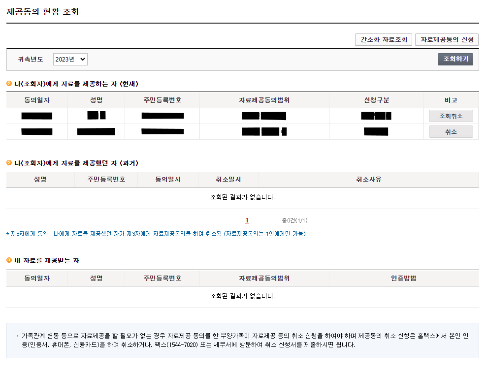 5. 신청하기 누르면 처리가 완료되었다는 팝업창이 나와요. 확인누르시고 잘 처리가 되었는지 제공동의현황조회 클릭!