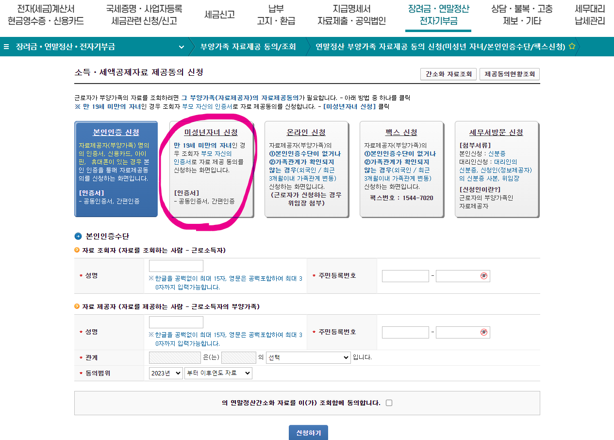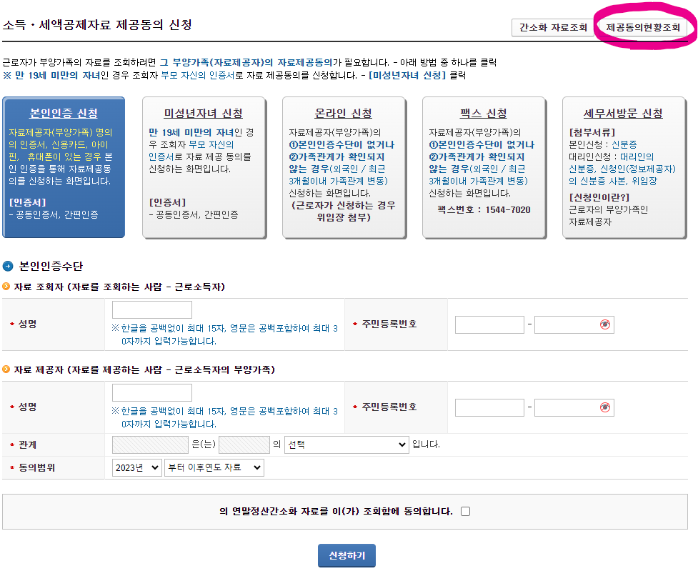 2. 연말정산 ▶ 연말정산간소화 ▶ 부양가족 자료제공 동의/조회를 클릭하세요.
