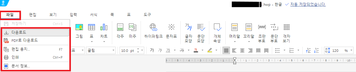 이제 문서작성을 하고 완료가 되었다면 저장해서 다운로드 받아야 겠죠?