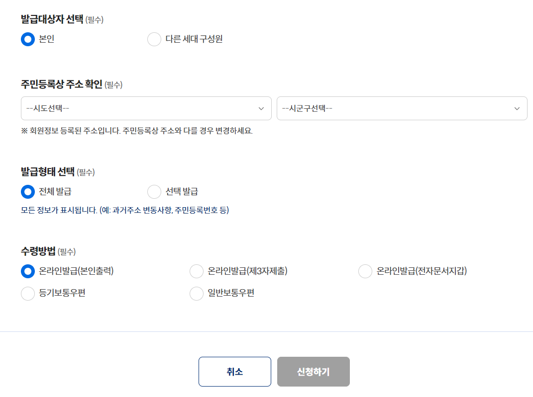 주민등록상 주소 선택 등 정보에 맞게 기입하고 신청하기 클릭!