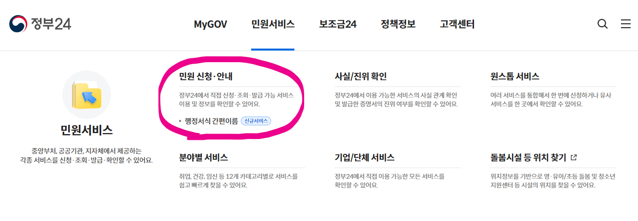 정부24는 정부의 민원 서비스, 정부혜택(보조금24), 정책정보/기관정보 등을 한 곳에서 한 눈에 찾을 수 있고 각 기관의 주요 서비스를 신청·조회·발급할 수 있는 대한민국 정부 대표 포털입니다