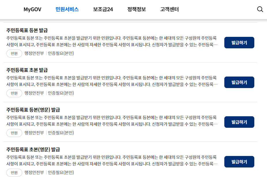 주민등록표 등본 또는 주민등록표 초본 본인에 맞는 걸로 발급하기 버튼 클릭!