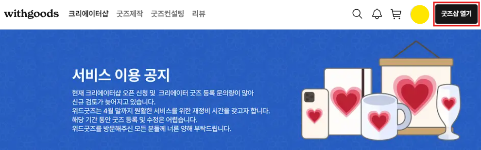 창작자 등록을 완료하면 오른쪽 상단에 굿즈샵 관리하기가 있는데 클릭!