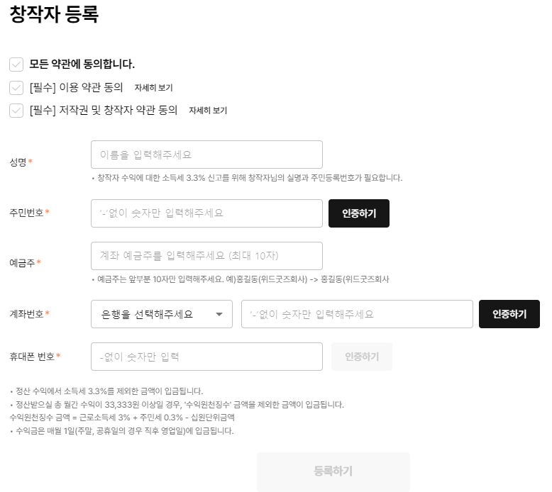 그럼 아래와 같이 창작자 등록화면이 나와요