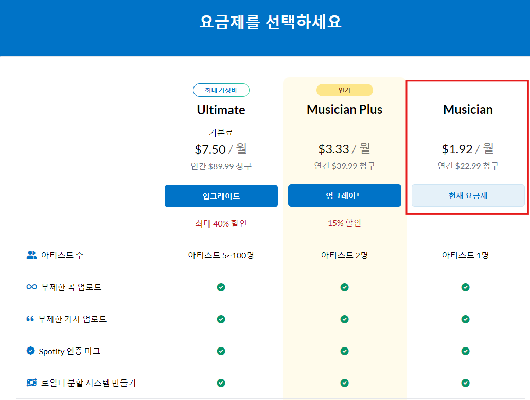 월 1.92달러 하는 뮤지션으로 가입을 추천 드려요 저도 그걸로 했는데