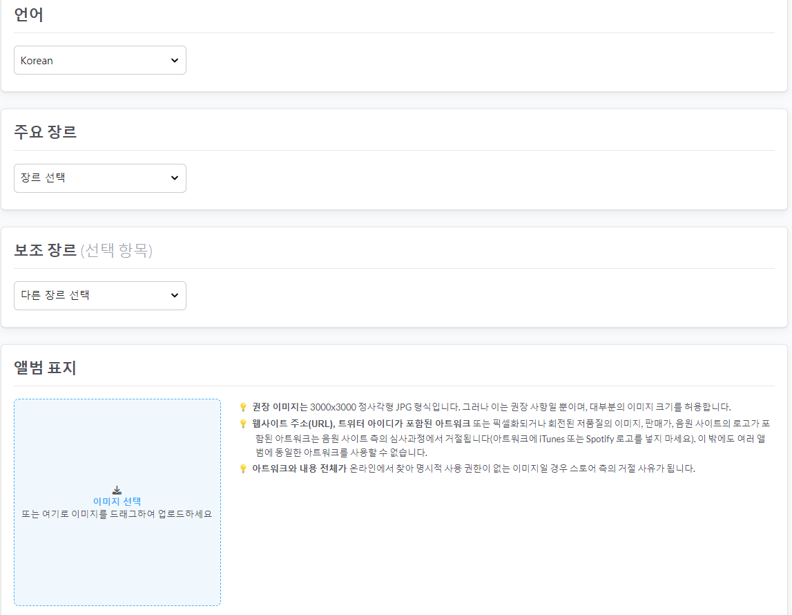 장르도 맞춰서 선택하고 앨범표지 이미지도 등록해요!