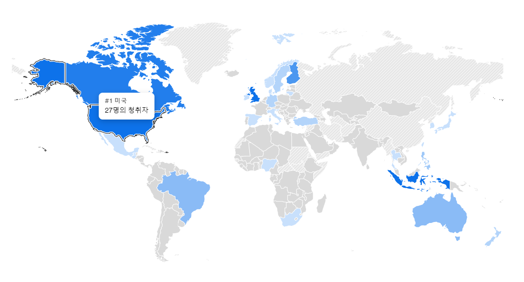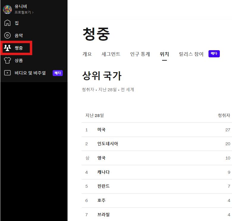 미국 사람들이 1위네요~ 제 노래를 27명이나 들었어요~!!