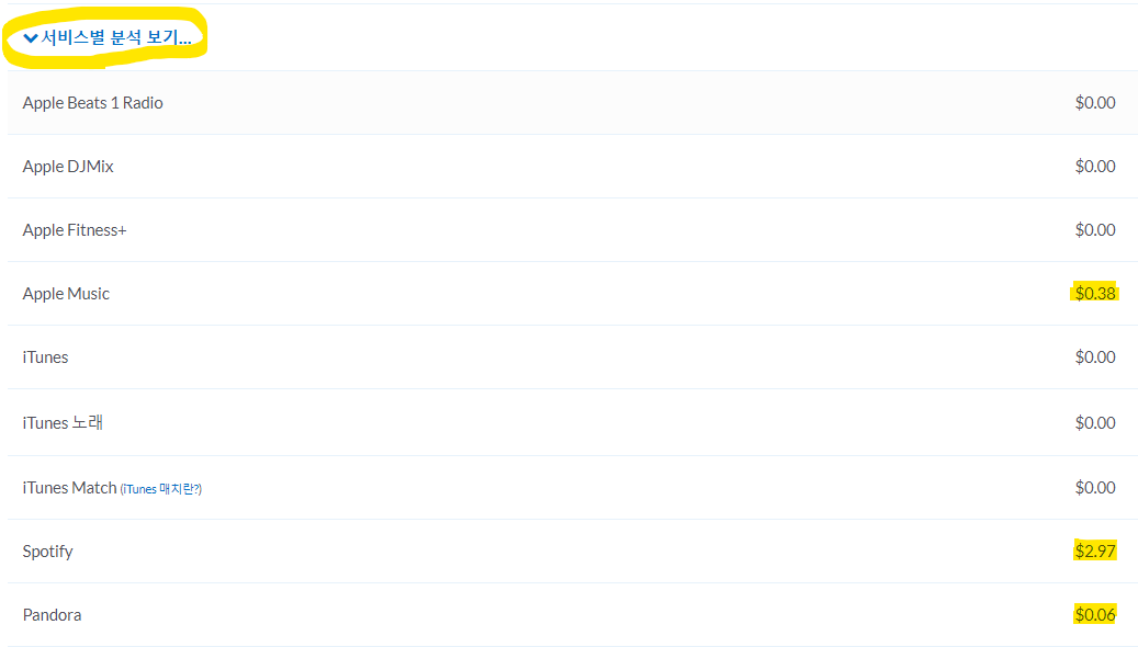 디스트로키드에서 서비스별 분석보기를 클릭하면 각 플렛폼마다 정산 금액을 보여주는 데