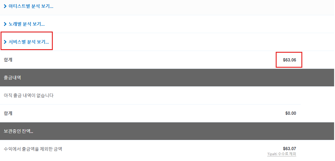 Spotify 수익만 놓고 보면 $4.83 이 정산된 것을 확인 할 수 있어요.