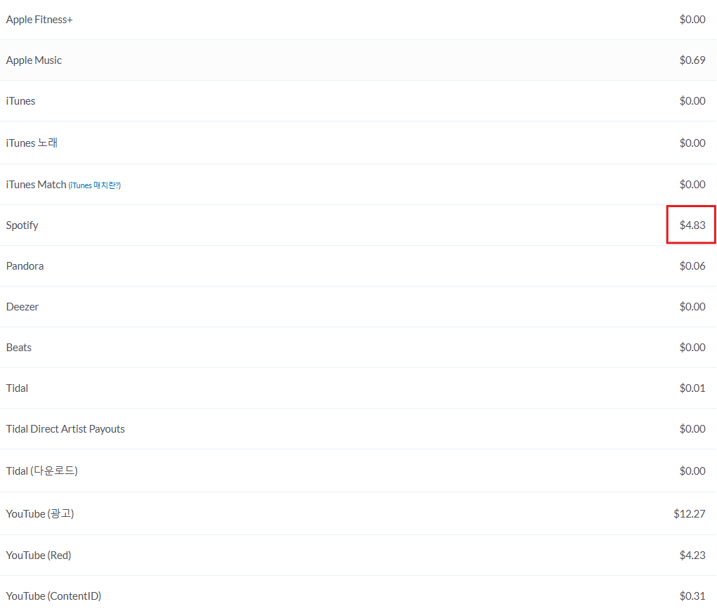 Spotify 수익만 놓고 보면 $4.83 이 정산된 것을 확인 할 수 있어요.