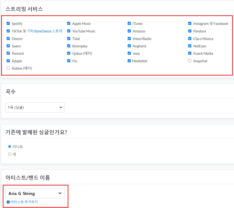 그럼 아래와 같은 화면이 나오는데 내가 음원을 배포할 플렛폼들을 선택해줘요