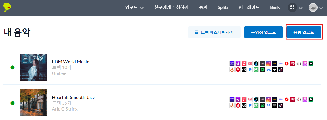 아래와 같이 메인 화면에서 음원 업로드 클릭!
