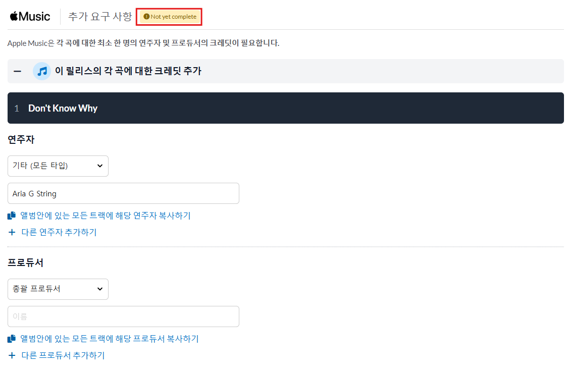 연주자와 프로듀서의 이름을 기입하라고 하고 기입하기 싫으면