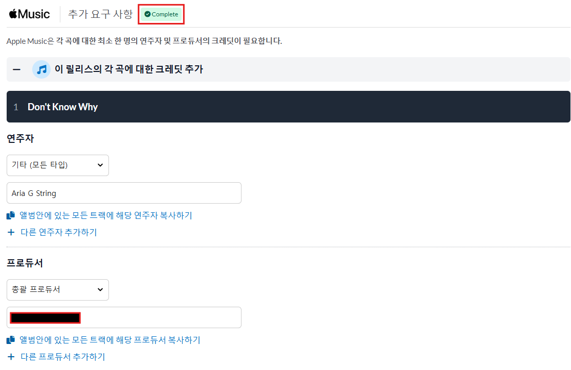 연주자와 프로듀서의 이름을 기입하라고 하고 기입하기 싫으면