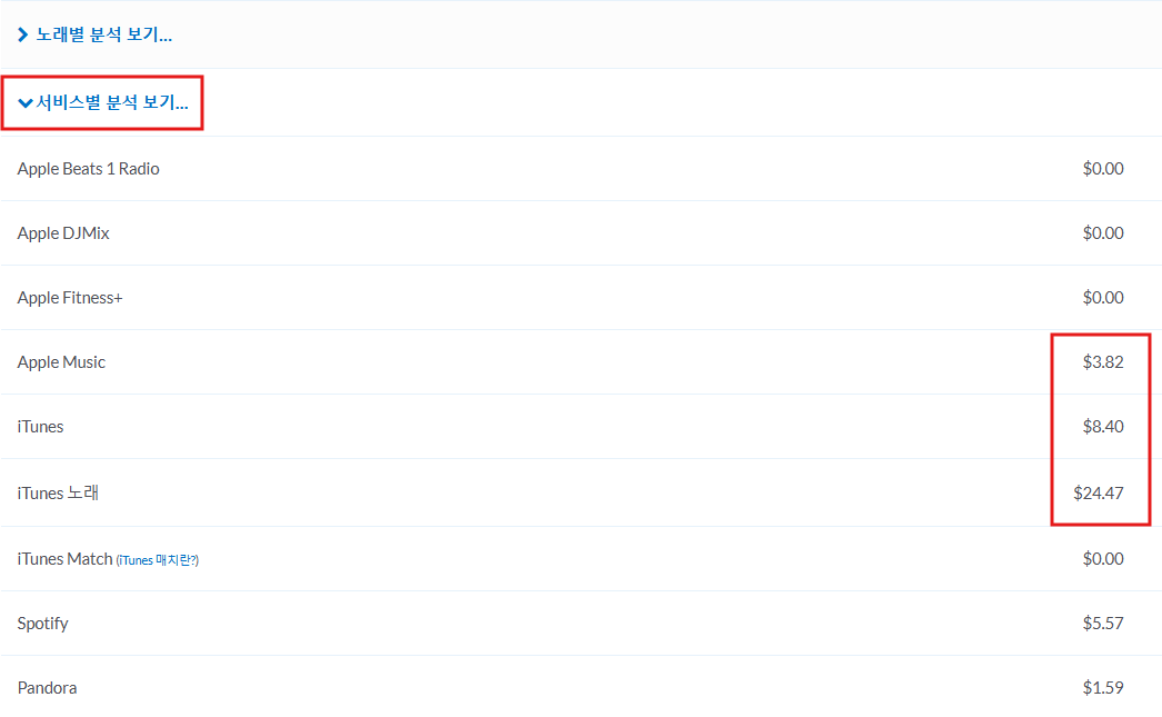 아래 서비스별 분석을 보면 Apple Music $3.82, iTunes $8.40, iTunes 노래 $24.47