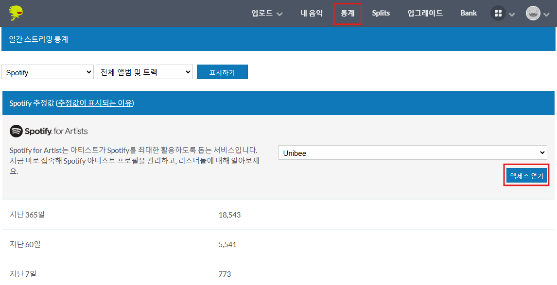 스포티파이 팔로워를 확인해야 되니 통계 메뉴에 접속하여