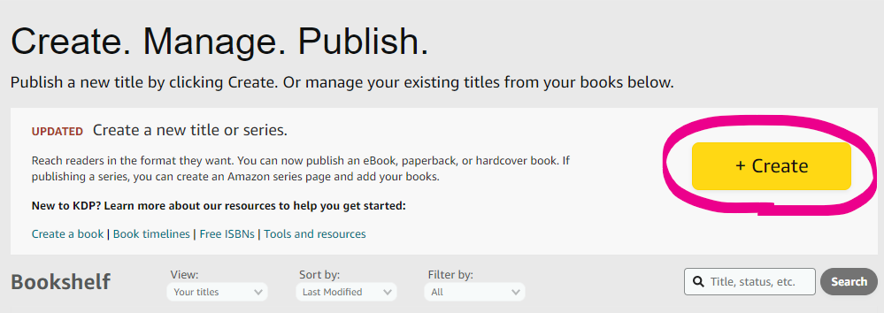 이제 준비가 완료 되었으니 아마존 KDP 에 디자인한 노트디자인을 등록해봐요.아마존 KDP 가입방법은 아래 링크로 보시면 되요https://unibeesoft.com/24 아마존 KDP 가입하는 방법아마존 KDP 가입 방법을 공유할께요~ 먼저 구글에 아마존 KDP 검색 귀찮으신 분들은 아래 링크로 클릭!! https://kdp.amazon.com/en_US/ Self Publishing | Amazon Kindle Direct Publishing "I've sold over 2 million copies of my bounibeesoft.com 가입 후 싸이트에 접속하게 되면 아래와 같은 화면이 나오는데 동그라미로 표시한 + Create 클릭! 여러가지 항목이 있지만 우리는 Create Paperback..