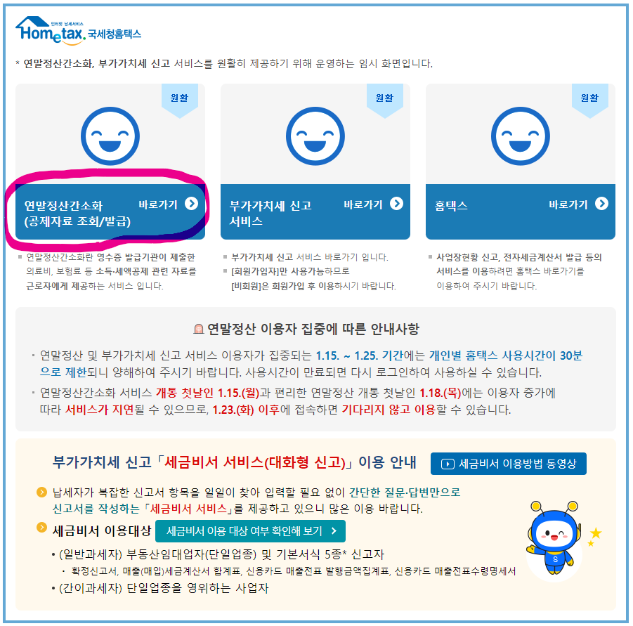 연말정산 간소화 서비스가 오픈되었다.1년에 한번하는 매우 번거롭고 귀찮고 헷갈리지만세금과 환급금 등 중요한 일이니 꼭 챙겨서 해야합니다.국세청 홈택스에 접속 아래 링크로 접속해도 됩니당!https://www.hometax.go.kr/ 국세청 홈택스 www.hometax.go.kr 접속하면 아래와 같은 화면이 나옵니다.고민하지 말고 연말정산 간소화 바로가기 클릭! 자 우리들의 친구 로그인 숙제가 기다리고 있습니다.인증서 로그인은 이제 지긋지긋하네요. 뭐 간편인증 로그인도 있으니취향에 맞게 로그인 고고~!! 와우 로그인 하면 아래와 같이 연말정산간소화 화면이 바로 나오네요.일일이 다 클릭할 필요없이 자료조회하기 를 누르면 모든 내역이 자동으로 나와요편리해 졌어요. 연말정산간소화 서비스 이용 순서도 안내되어있..